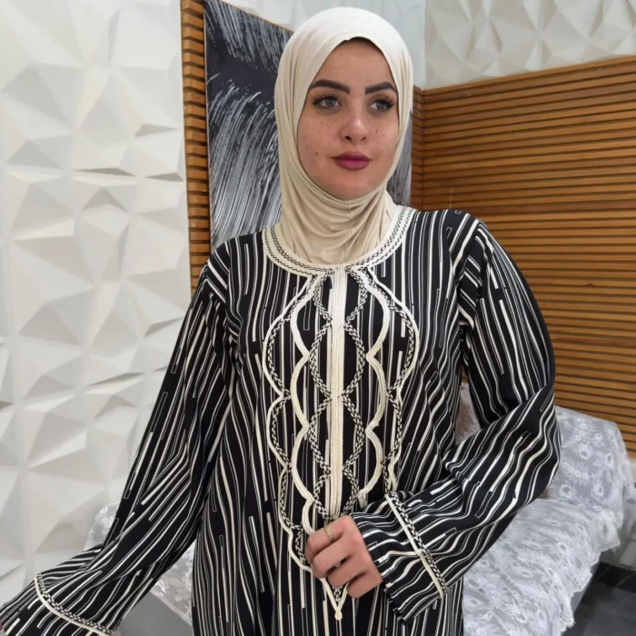 تتألّق العباية بـ تطريز قيطان متقن عند الصدر